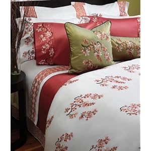 Delicate cherry blossoms are embroidered on these luxurious sateen sheets, duvet covers and shams. Choose from white or salsa colored sateen. Decorative pillows are embroidered on olive silk taffeta. Fitted sheets have 16" deep pockets. Fitted sheets are plain with no embroidery. Tailored bedskirts have a 16" drop.